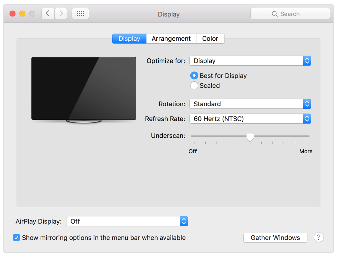 To fix overscan on Mac: Go to System Preferences, then Display. A pop up window should show up on every display you have connected (see picture below). Click on the Gather Windows button at the bottom of the popup window on your main display to gather all the popup windows. Find the popup window that has the name of your display in the title bar. Adjust the Underscan slider to adjust the display output. The more you slide to the right, the more the display will zoom in. Slide it until your display shows correctly on your TV/monitor output.