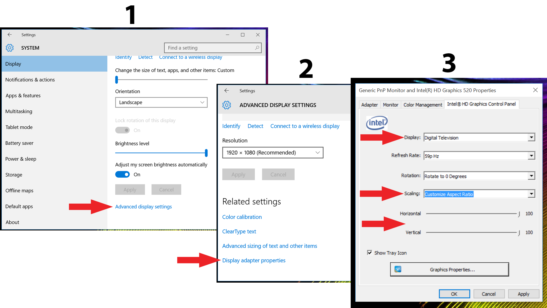 To fix overscan on Windows: Right-click on your Desktop and click on Display settings (see the picture below). Click Display, then scroll down and click on Advanced display settings (this will be a small blue link). On the next screen scroll down to the bottom and click on Display adapter properties. This will bring up your graphics card settings. From here it depends on what your card is. Most Windows laptops come with integrated Intel graphics cards. For these laptops, click on the Intel Graphics Control Panel. Select the second screen under Display, then select Customize Aspect Ratio under Scaling. Slide the horizontal and vertical scrollbars to the left and hit Apply. You can tweak these values to fit the screen exactly. If you have a different video card, consult your video card's documentation.