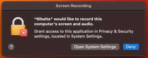 This is because Ribalta needs screen information to detect motion on the screen. We do not store any information from your screen in Ribalta or on our servers. In order to use detection mode in Ribalta, you will need to grant access. To do this, click on the Open System Preferences button. You will see a second pop-up asking you to allow this setting. Click allow. Ribalta should work correctly now.