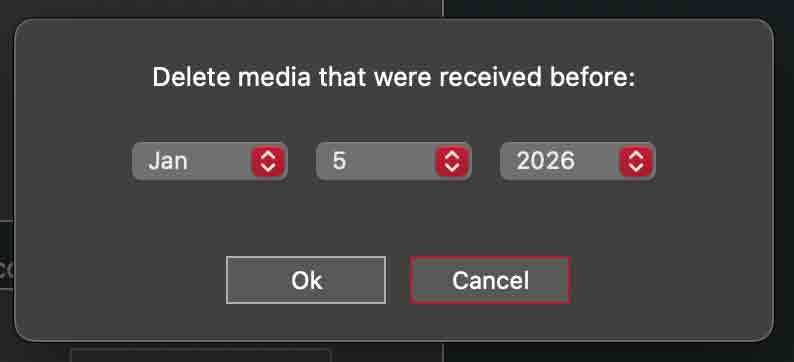 You can reduce the amount of disk space Ribalta is using by deleting old media. Click on File → Delete Old Media in the pulldown menu. Ribalta will prompt you for a date (1 month ago by default). Click Ok to delete all pictures received before the date.