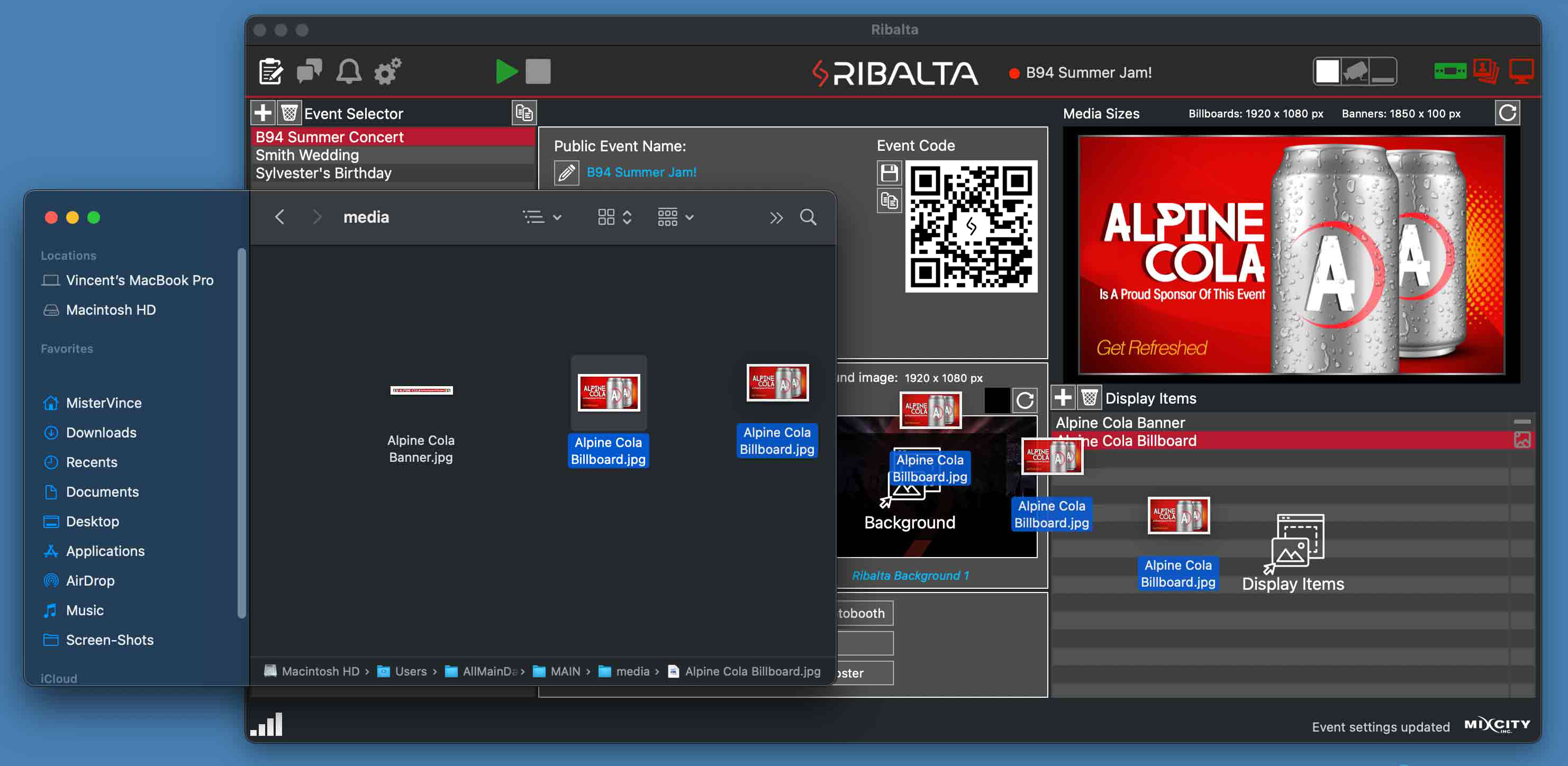 The files you dragged will load directly to the selected Event Profile. Drag the image title up or down in the Event media items list to change the order in which they will display. Items closest to the top will display first. After all items have been shown, Ribalta will restart the rotation with the topmost item. The recommended media size to use for full screen billboards is 1920 by 1080px resolution, but any 16:9 aspect ratio will fill the screen. The recommended media size for overlay banners is 1850 by 100px (the overlay size banner is only necessary if you are using Detection Mode or Banner Mode). Ribalta is smart enough to determine which images are full screen billboards (full Screen size) and which images are the overlay banners. There is no need to specify a banner differently from a billboard. There is also no need to organize them in a different location inside Ribalta. Simply load all your media into the desired Event Profile, and let Ribalta sort it out for you. You can also drag existing media that does not match the recommended size guidelines; Ribalta will do its best to fit these items on the display correctly.