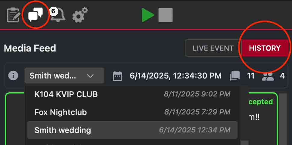 Click on the Media Feed icon in the toolbar, then click History to view the History. Use the pull down menu to select the past event that you want to view. On this page, you can view past events, summary stats on the event, along with pictures from the event. You can export individual pictures from events. You can do this from the Desktop app, from the mobile app or from the Ribalta webapp that your guest use to participate in your event. Anyone with the event link or QR code can share and download the event photos.