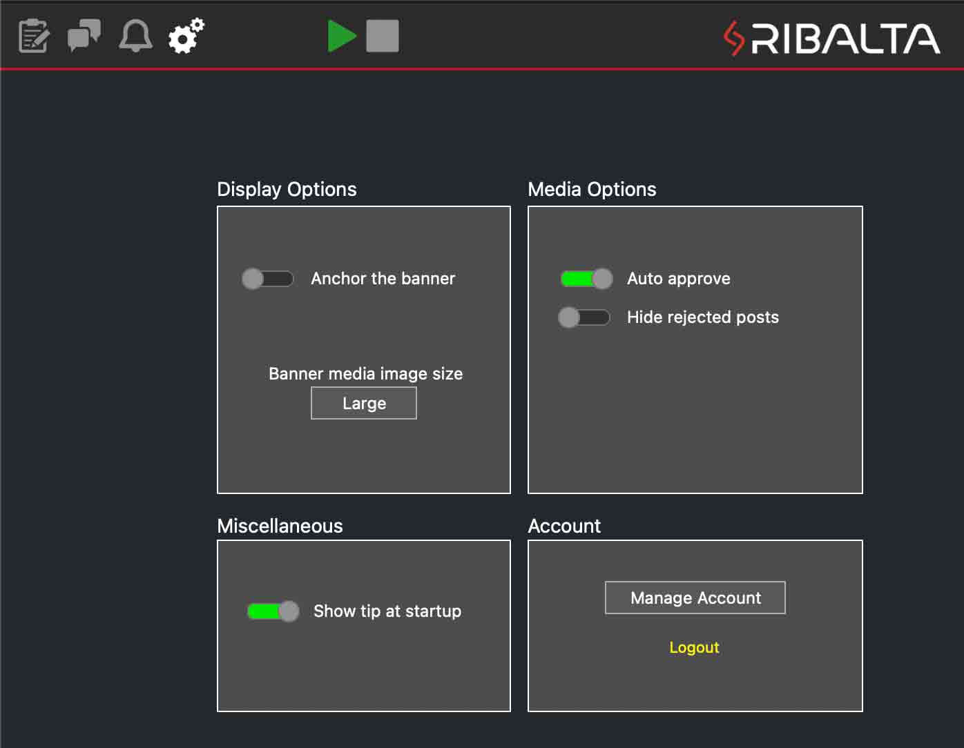 A Ribalta event is a period of time when Ribalta is actively searching for new images from the Internet and showing them in the display. When you first launch Ribalta, there is no event in progress. When you arrive at your venue, select a Event Profile and then click PLAY to start your event. Pressing play does a few things.