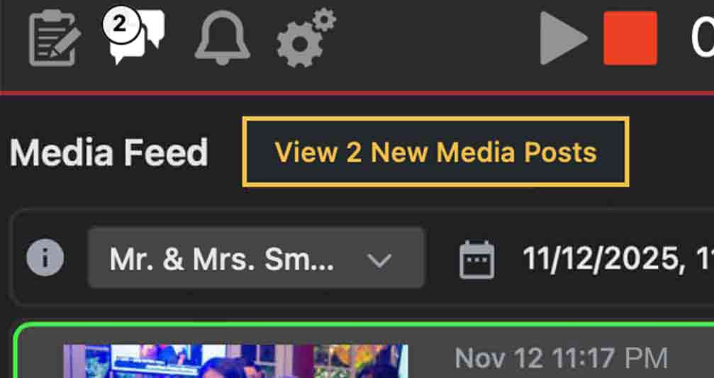 Guest scan the code or click the link you sent them to participate. Once a guest sends in a picture, you will see View new media post appear in yellow in the middle of the screen, letting you know you have a new media post.